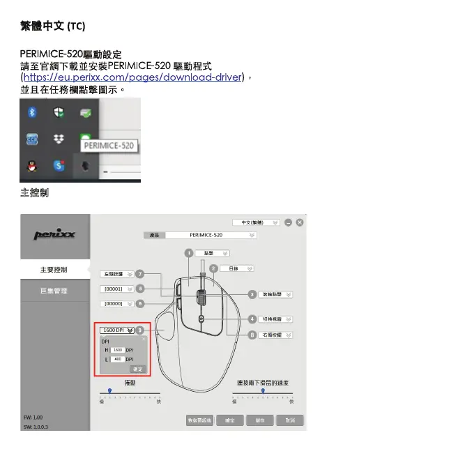 在PERIMICE-520上總共有8個按鍵可分配不同的功能。第9個按鍵只能用來設定DPI。