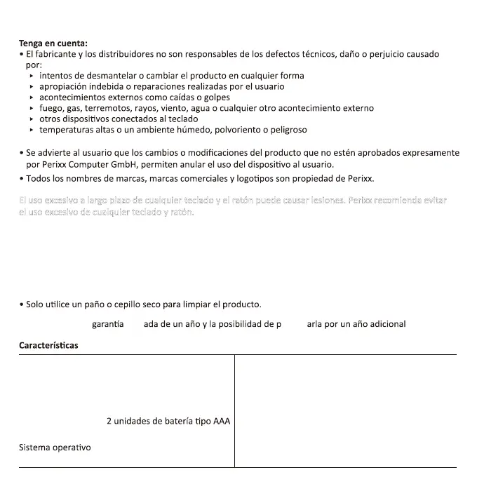 El uso excesivo a largo plazo de cualquier teclado y el ratón puede causar lesiones. Perixx recomienda evitar