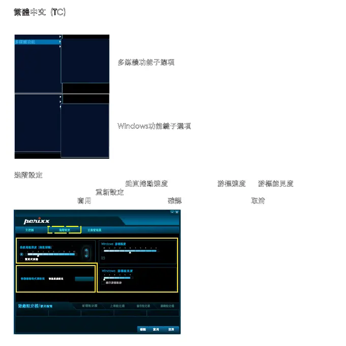 在A區塊中,您可以設定您所需的 [垂直捲動速度] (滑鼠滾輪)、[游標速度]及[游標能見度]。