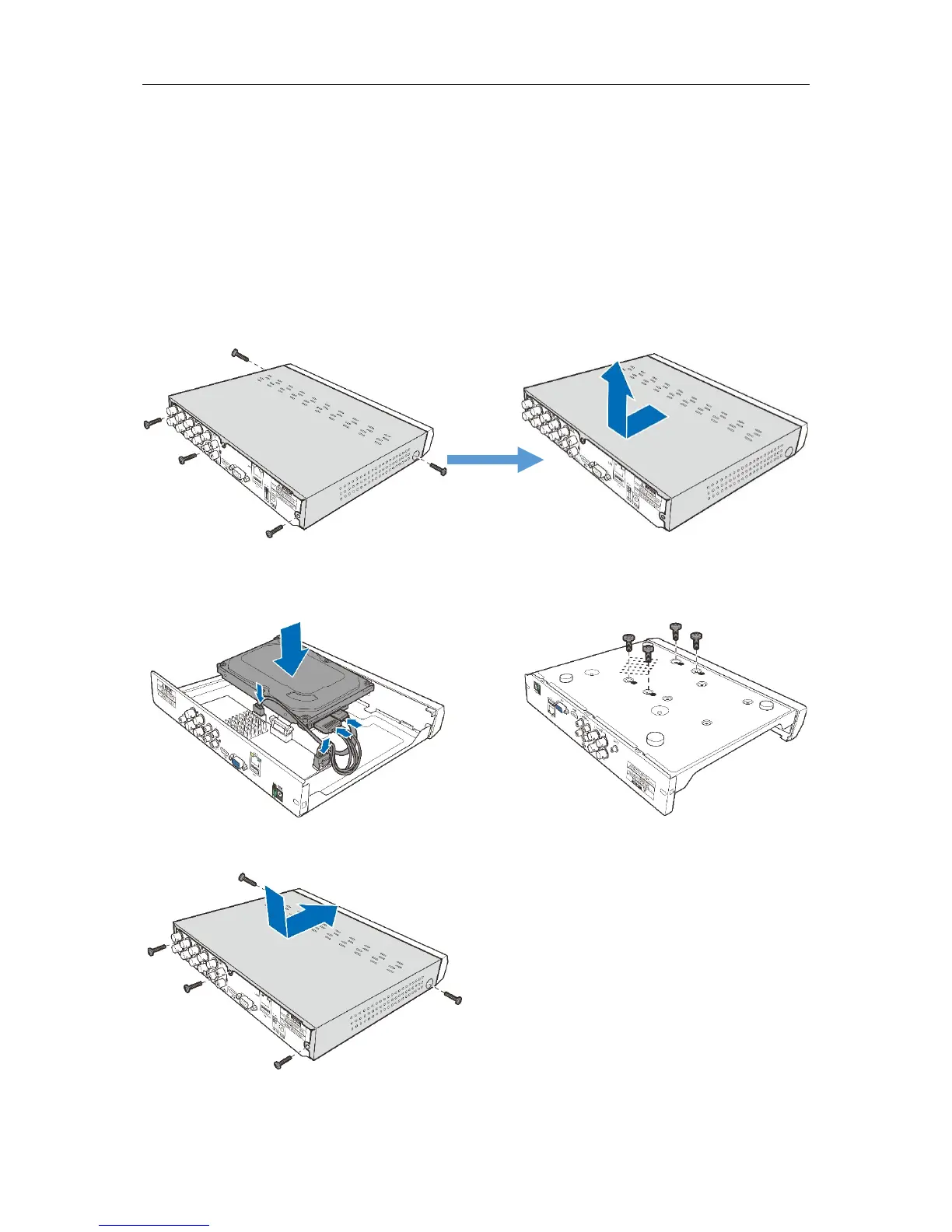 (1) Cut power firstly, and then remove screws on both sides & rear panel, and open DVR upper cover.