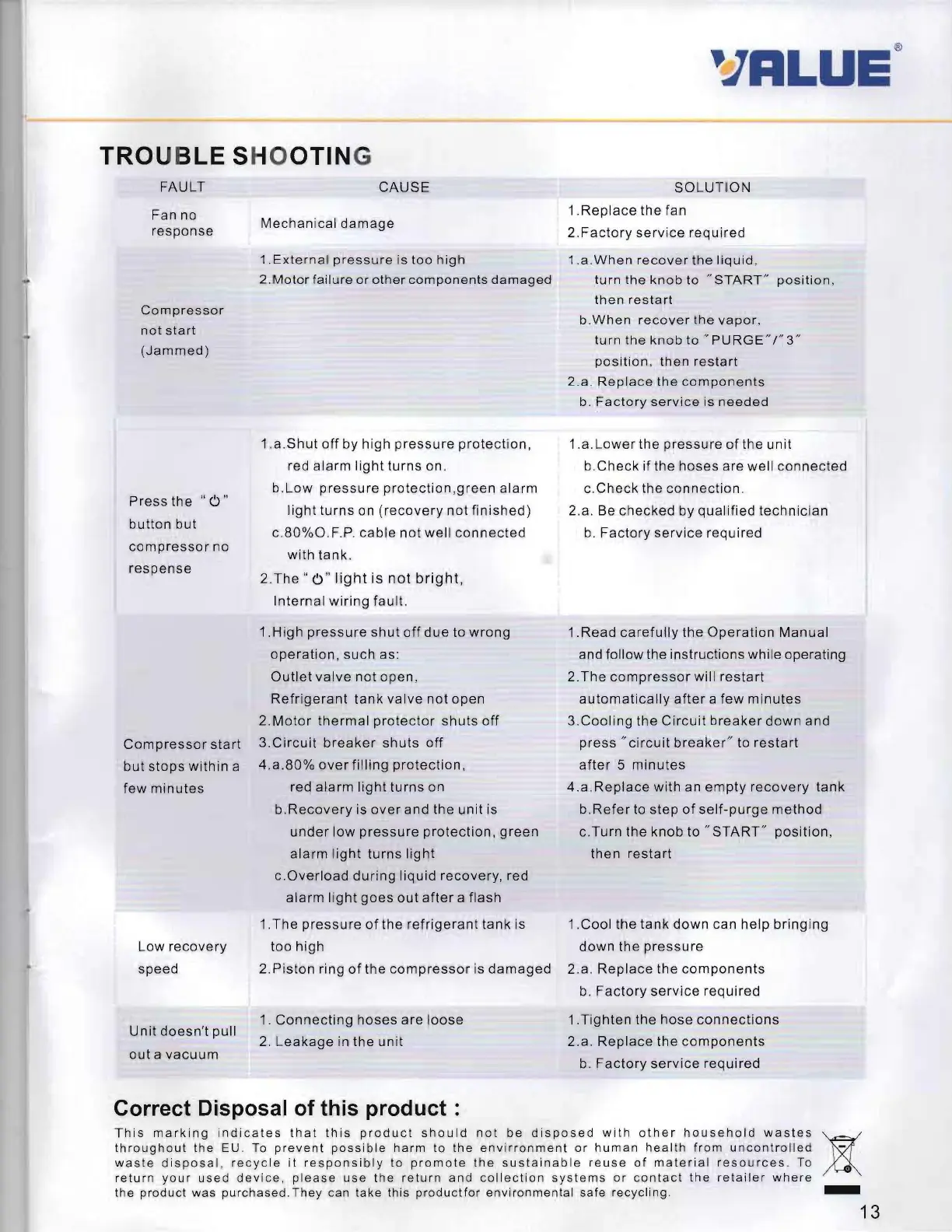 Value VRR12L-R32 - Troubleshooting; Common Faults and Solutions