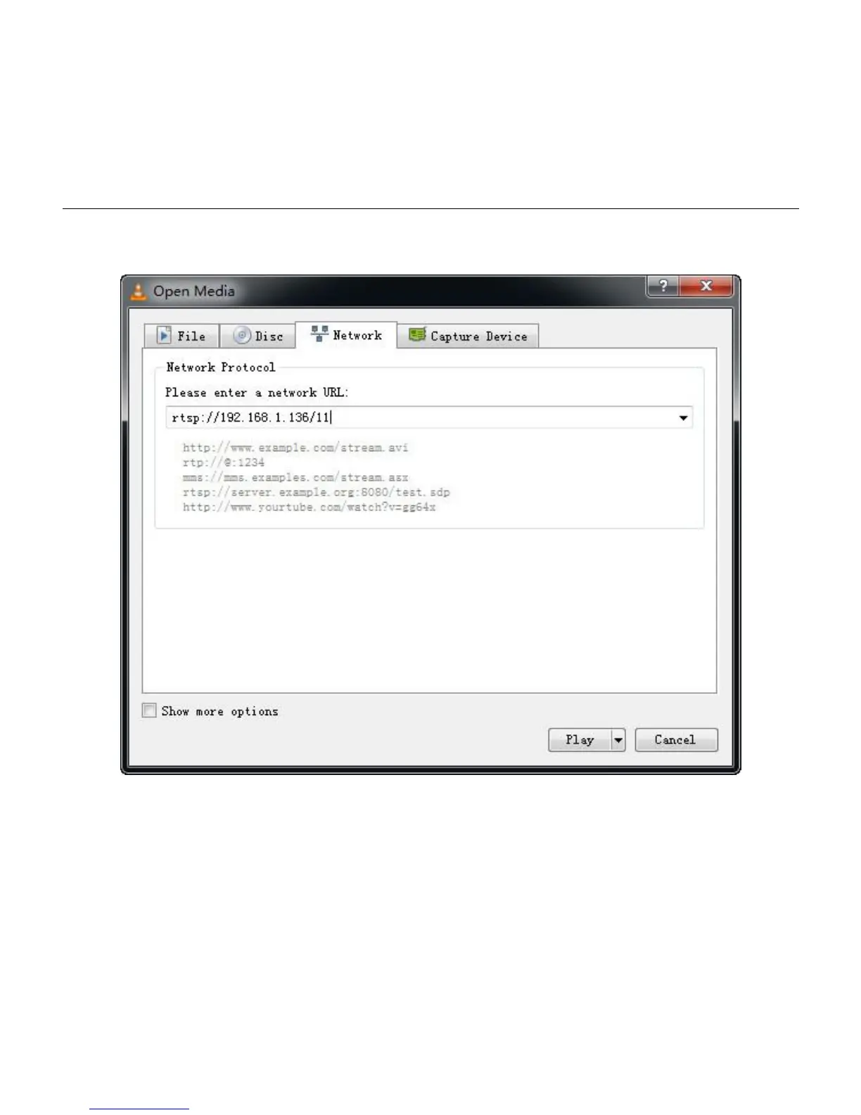 1.2 Input URL address: rtsp://ip: port/11(Main stream); rtsp://ip: port/12(Sub stream)(When port set as rtsp,