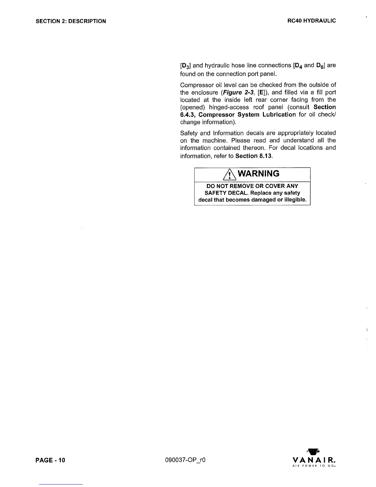 Vanair RC40 - 6.4 PARTS REPLACEMENT AND ADJUSTMENT PROCEDURES; 6.4.1 REMOVING PANELS FOR MACHINE MAINTENANCE ACCESS; 6.4.1.1 OPENING AND CLOSING THE ROOF PANEL
