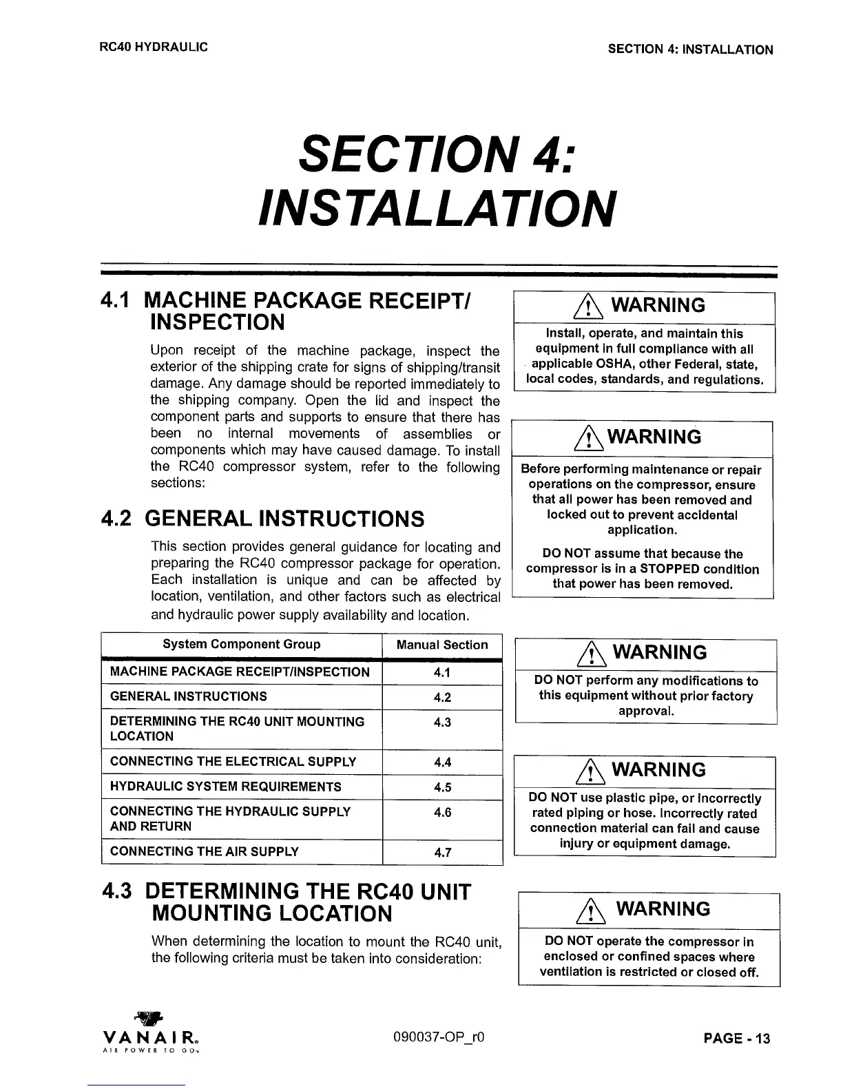 Vanair RC40 - 6.4.3.2 CHANGING THE COMPRESSOR OIL; 6.4.4 AIR FILTER MAINTENANCE; 6.4.4.1 INSPECTING THE AIR FILTER(S)