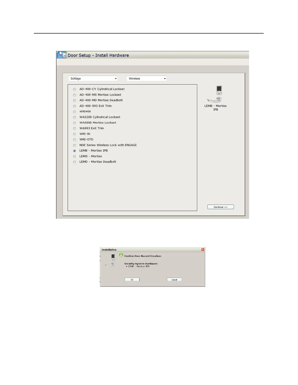 5 Click on the Continue button. The Installation pop-up window will open asking to Confirm Door Record