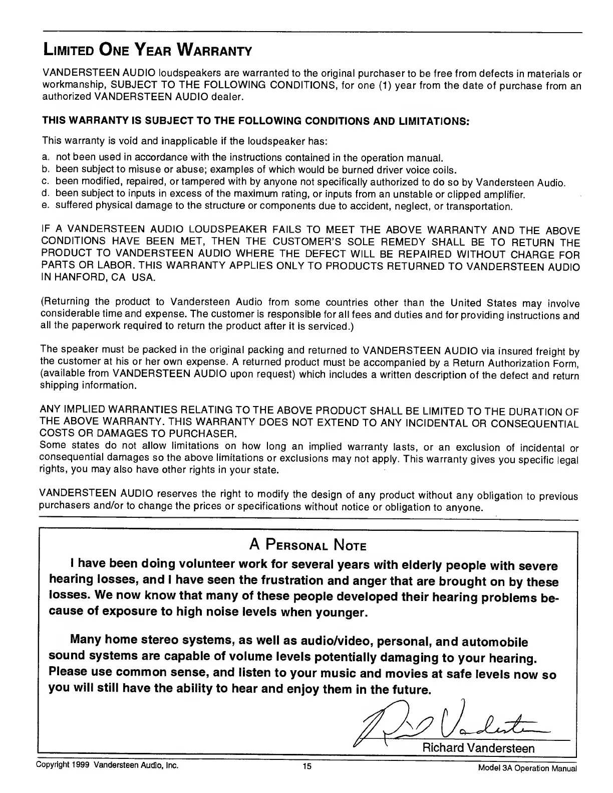 VANDERSTEEN 3A - LIMITED ONE YEAR WARRANTY
