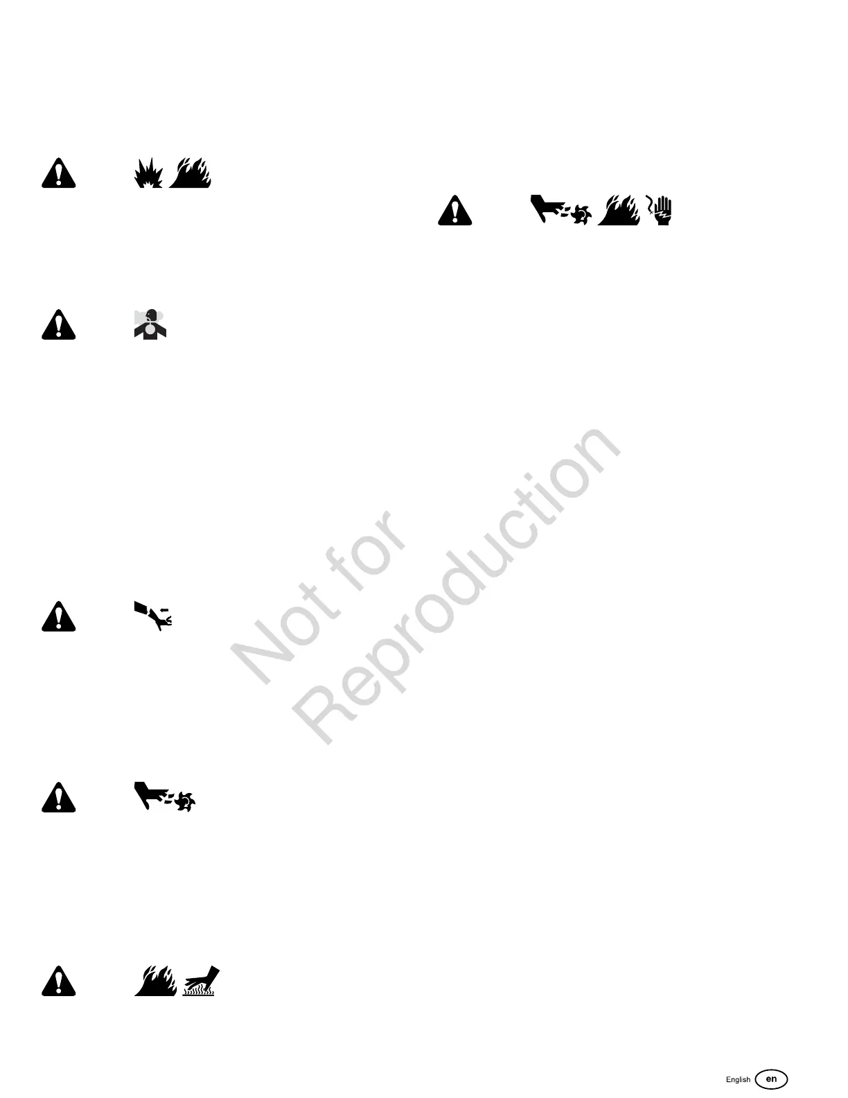 Rapid retraction of starter cord (kickback) will pull hand and arm toward engine