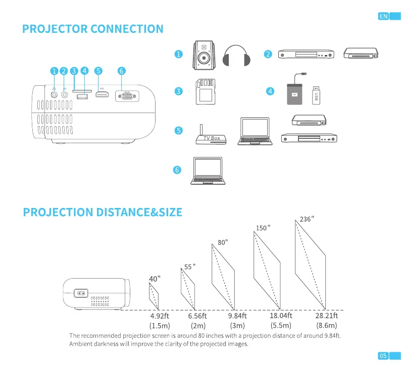 The recommended projection screen is around 80 incheswith a projection distance of around 9.84ft.