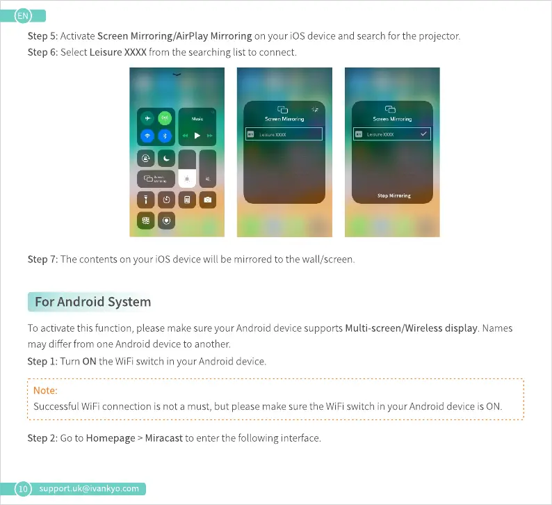 Step 5:ActivateScreenMirroring/AirPlay Mirroring on your iOSdeviceand searchfor the projector.