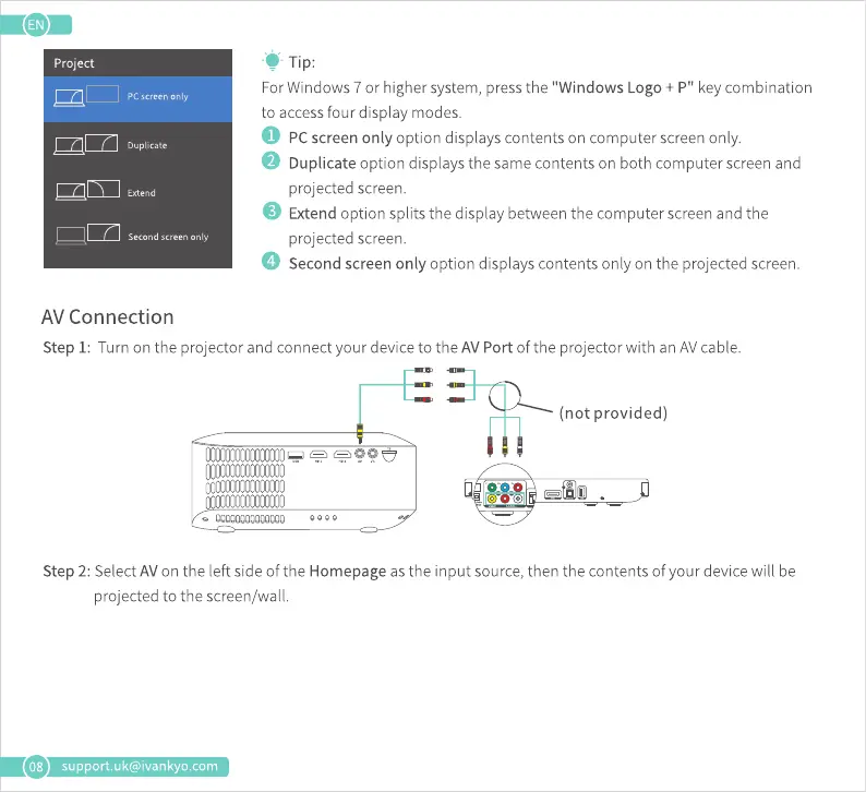 Step I: Turn on the projector and connect your device to the AV Port of the projector with an AVcable.