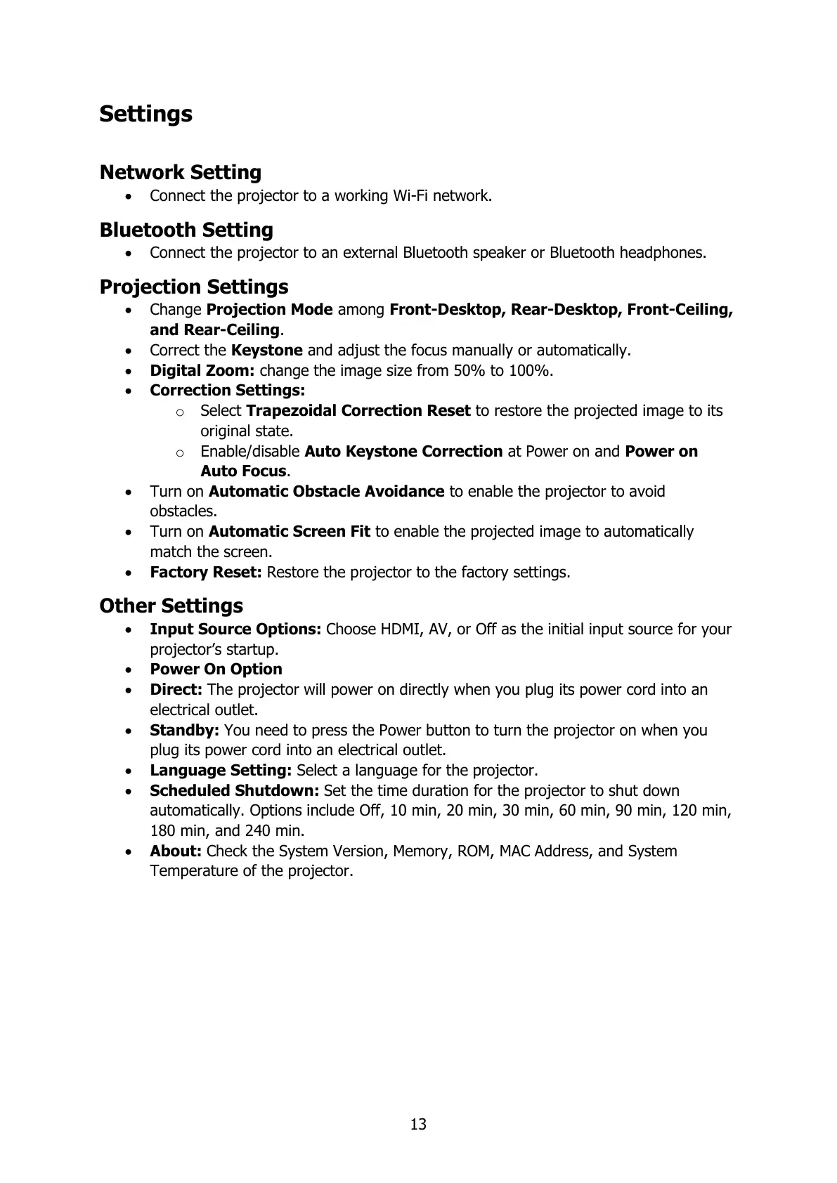 Language Setting: Select a language for the projector.