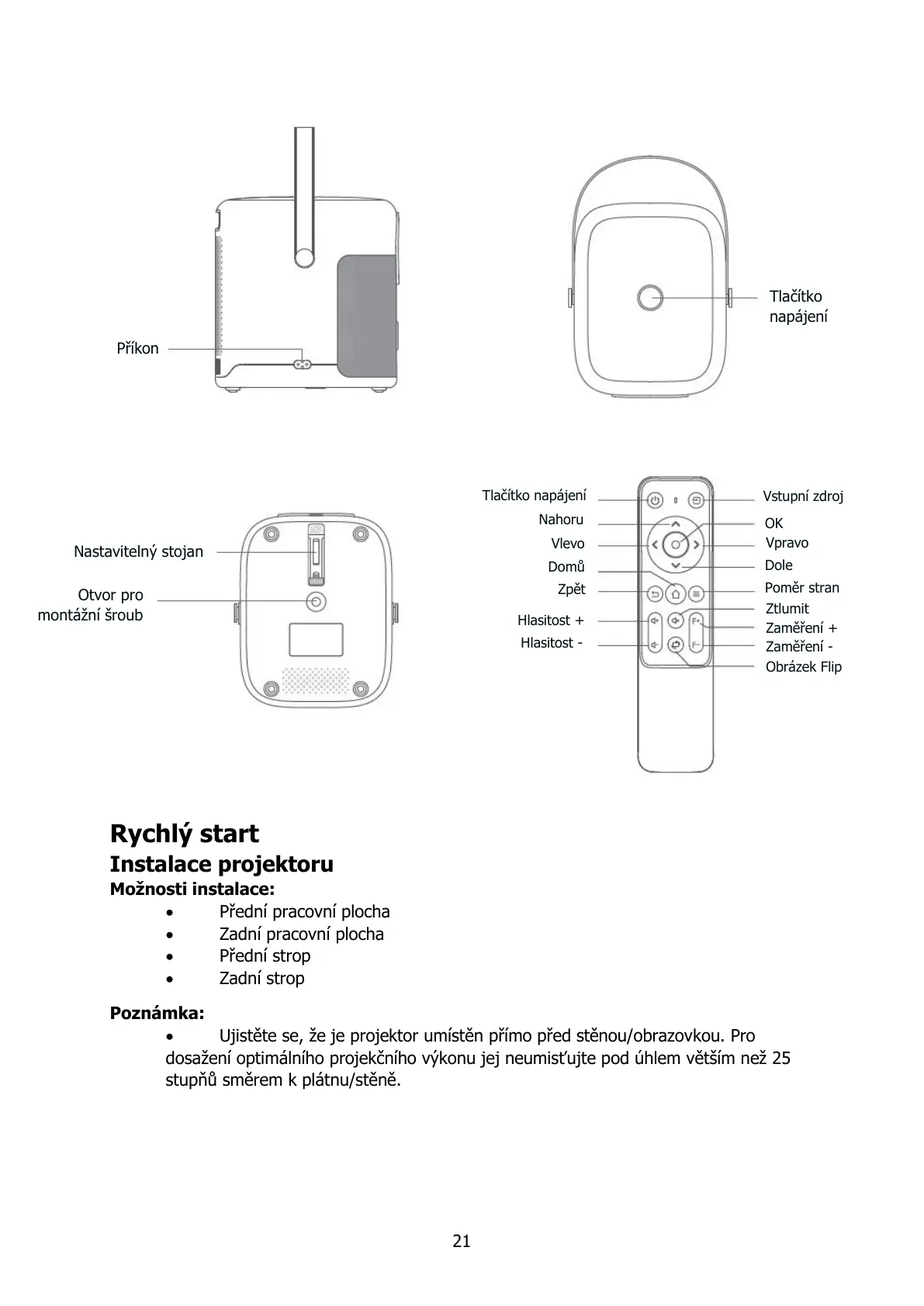 dosažení optimálního projekčního výkonu jej neumisťujte pod úhlem větším než 25