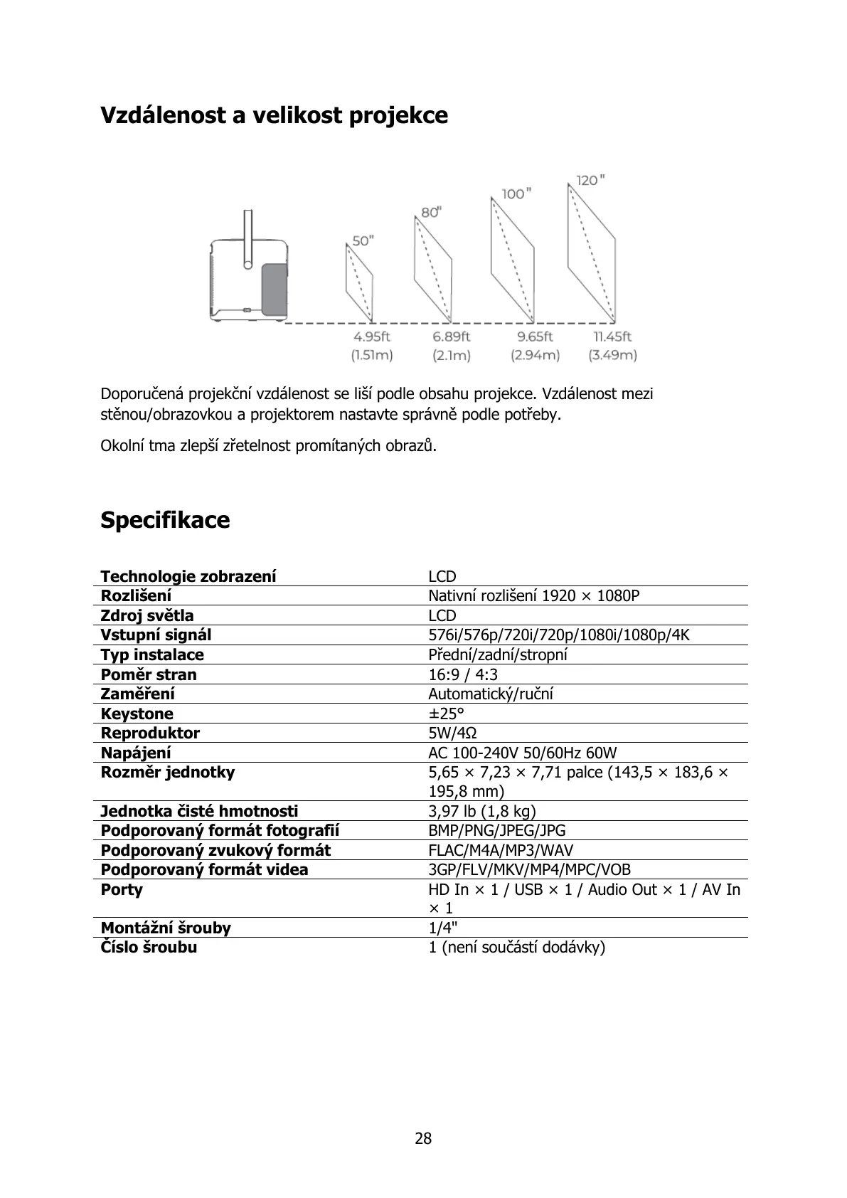 Doporučená projekční vzdálenost se liší podle obsahu projekce. Vzdálenost mezi