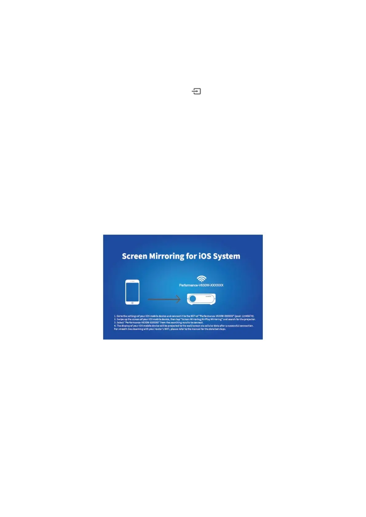 1) Zapněte projektor a jako vstupní zdroj vyberte Zrcadlení obrazovky, abyste vstoupili