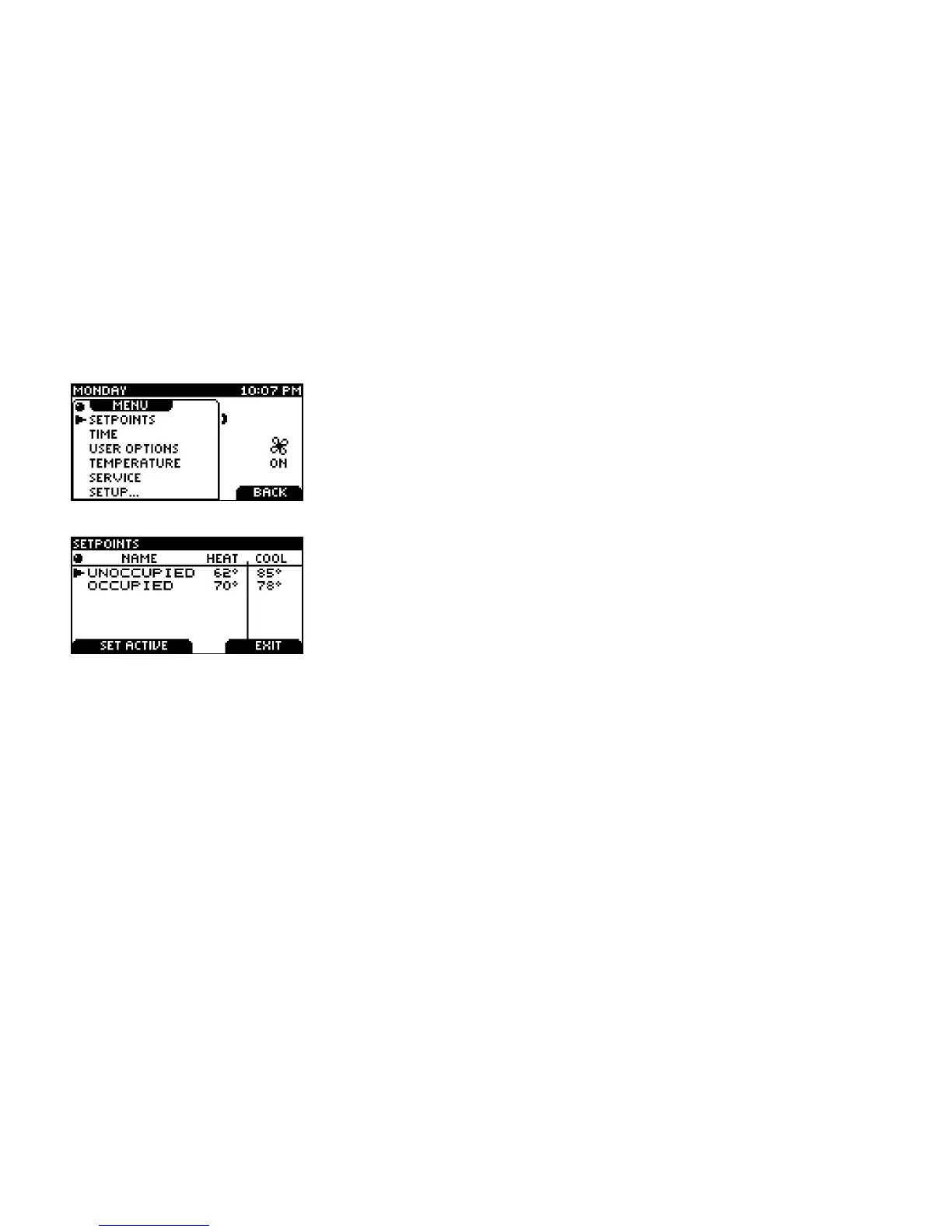 Follow these steps to change the thermostat from OCCUPIED to UNOCCUPIED setpoints.