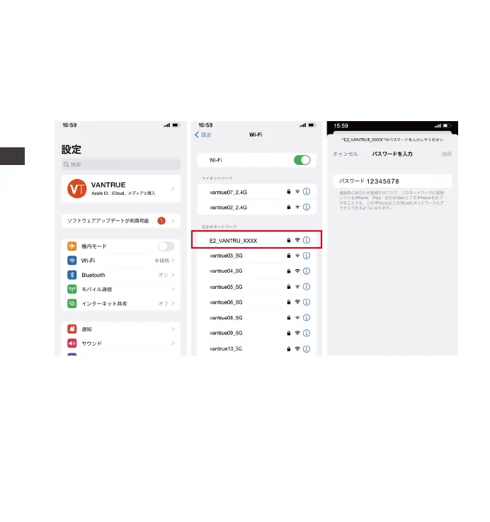のWiFi信号(例:E2VANTRUEXXXX)を見つけて初期パスワード:12345678を入力