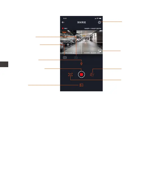 视频预览:APP连接记录仪成功后,记录仪进入实时预览页面,点击全屏按钮