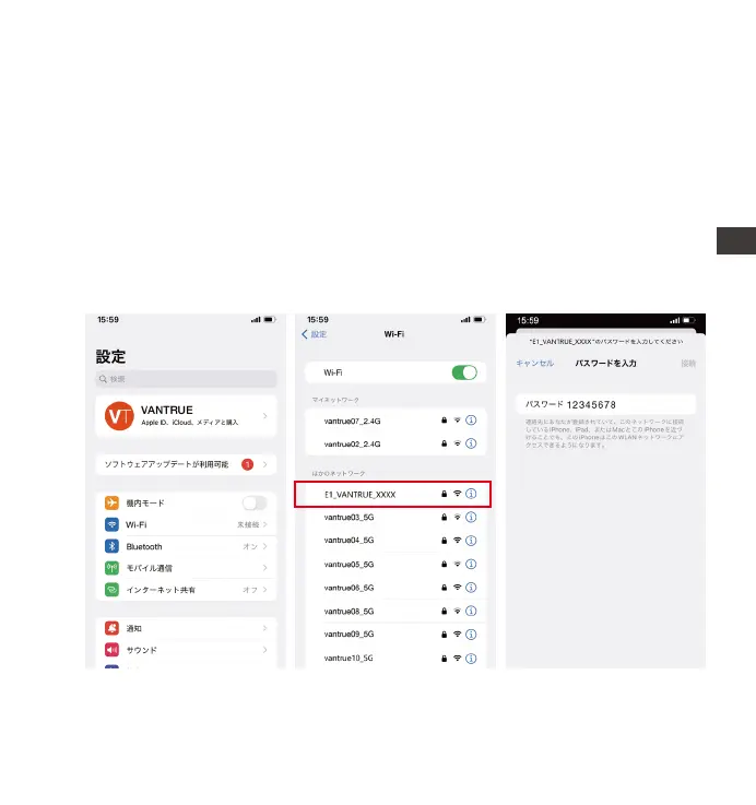 のWiFi信号(例:E1VANTRUEXXXX)を見つけて初期パスワード:12345678を入