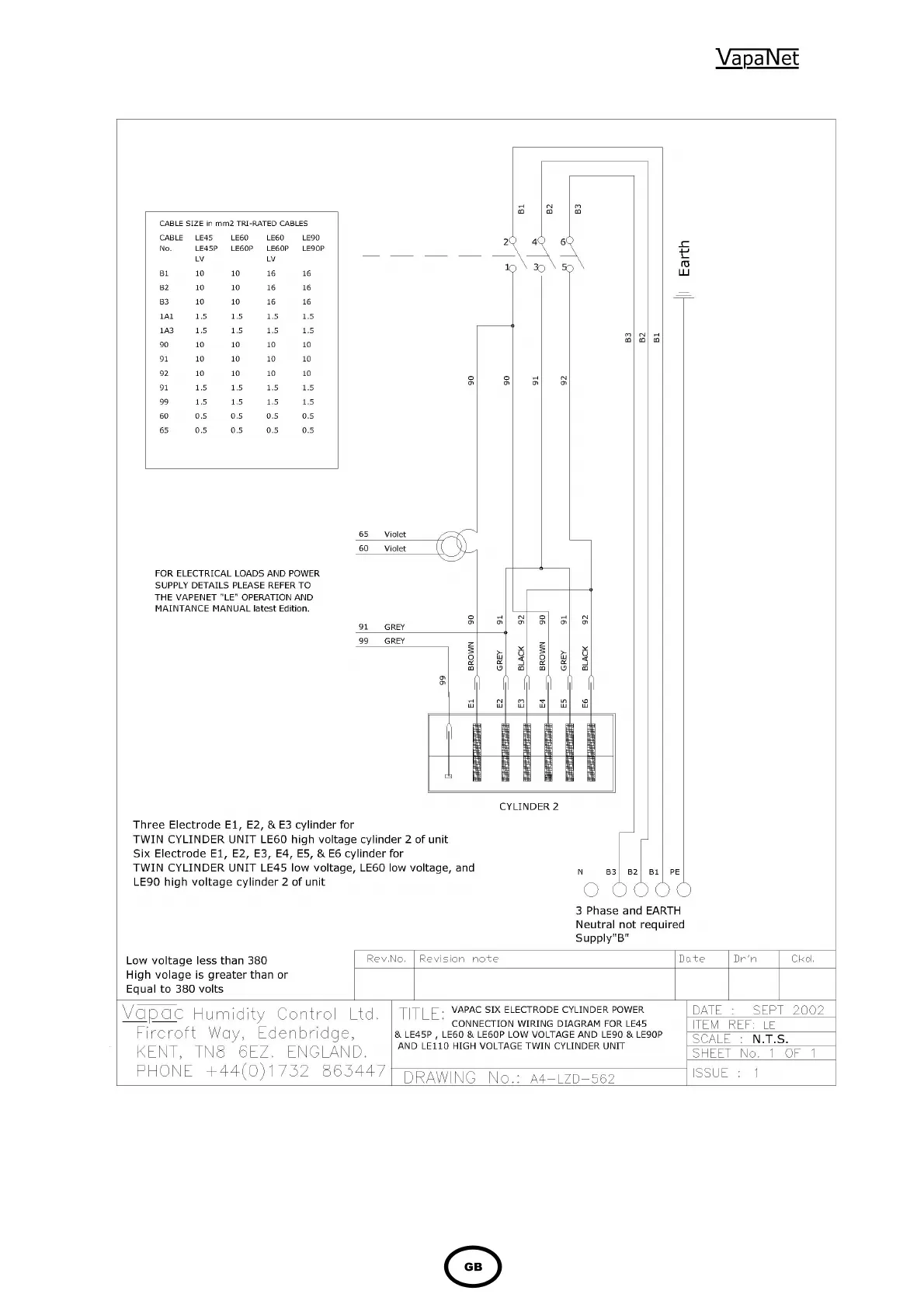 Vapac LE30 - Twin Cylinder Power Wiring (LE45-LE110)