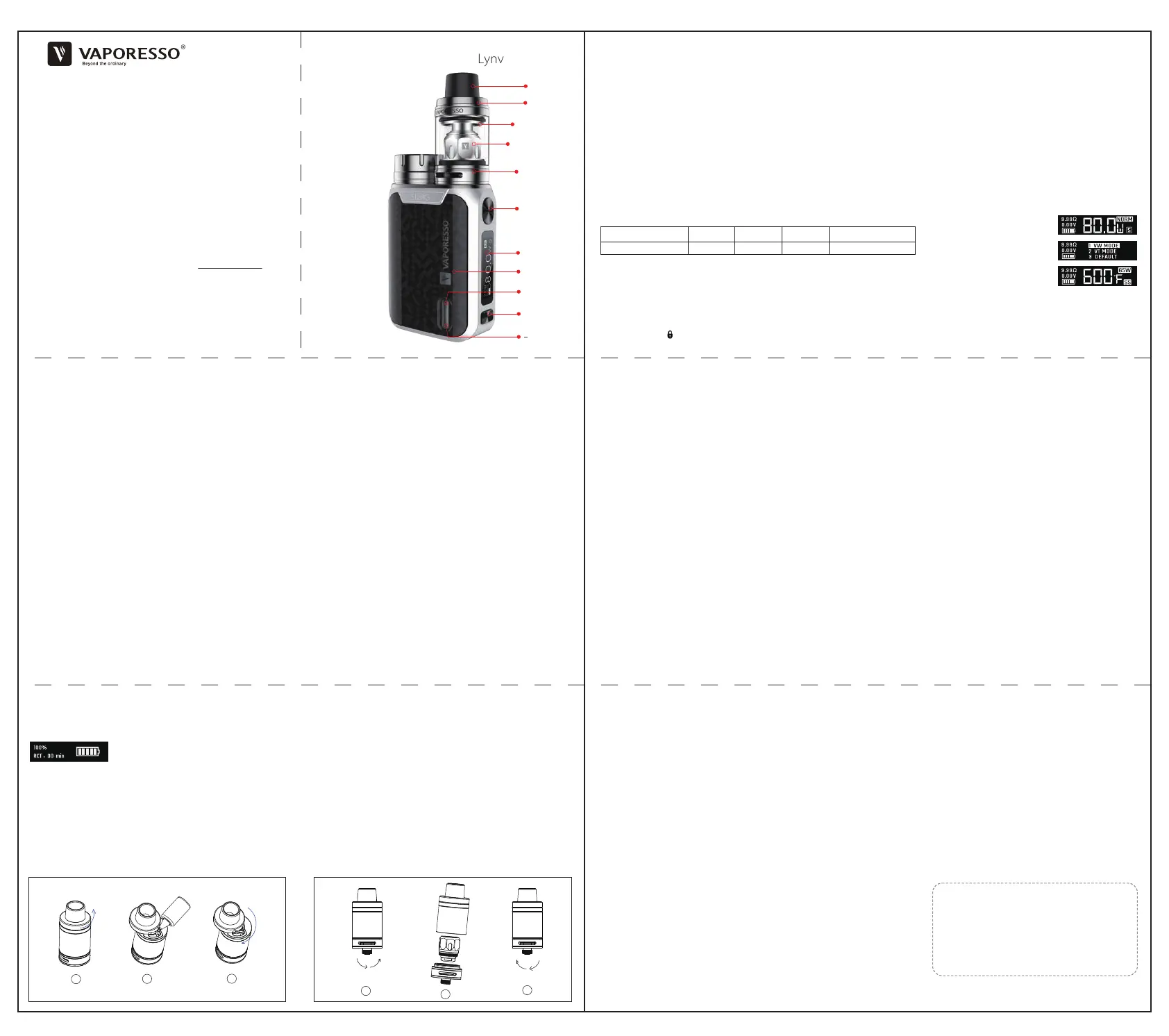 Når man tænder enheden vil OLED displayet fremvise volt resistenser, batteri niveau, temperatur, watt osv. Tryk på tænd knappen når som helst og skærmen vil blive tændt