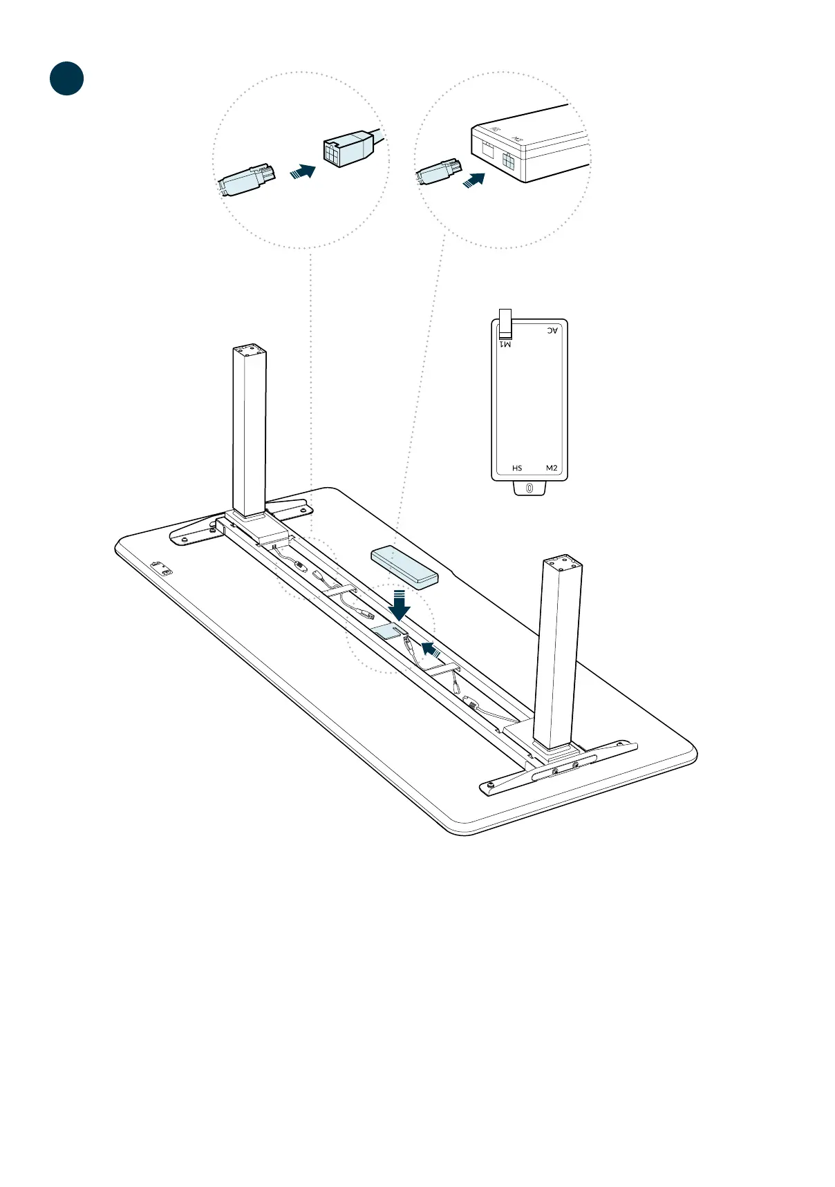 Once the legs are secured with screws and while the desk is sll face down, lower the control box