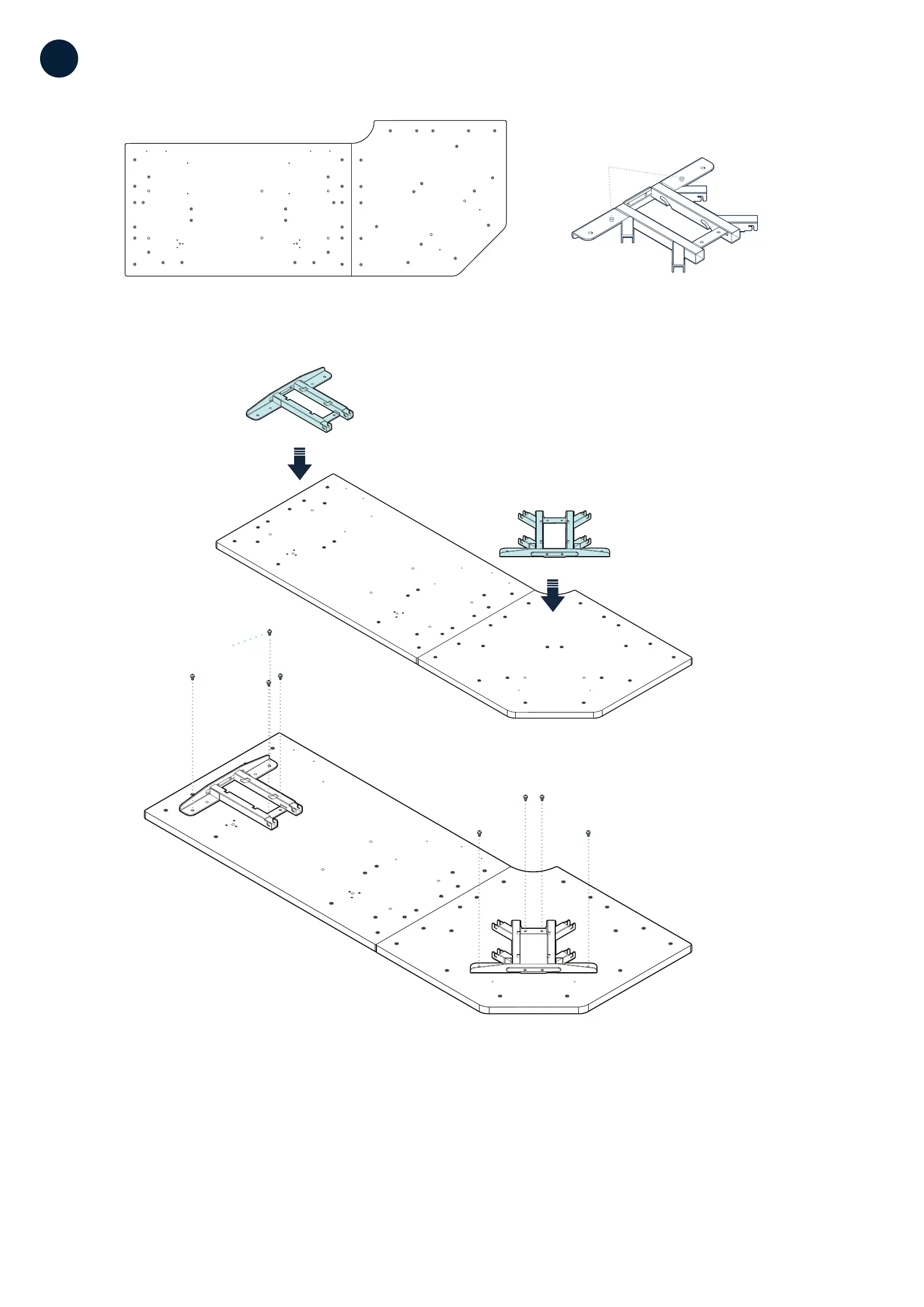 Note : Nous recommandons d'assembler le bureau face vers le bas sur une surface lisse, exempte de débris et plate pour éviter les