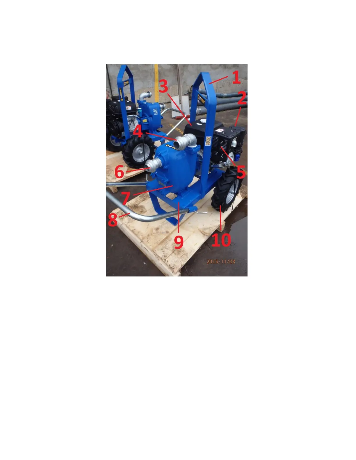 Exhaust silencer, 6 Port with quick coupler, suction pipe, 7 Pump unit, 8 Moving handle, 9