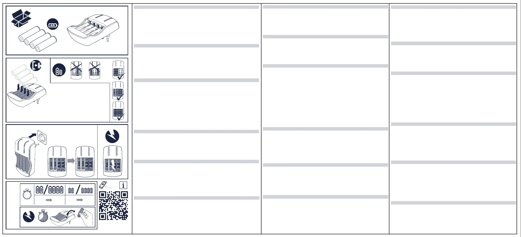 Illustration 1: Insérer les batteries de même taille et puissance par paires. Chaque pile doit être connectée aux deux pôles. Illustration 2: Brancher le chargeur dans une prise