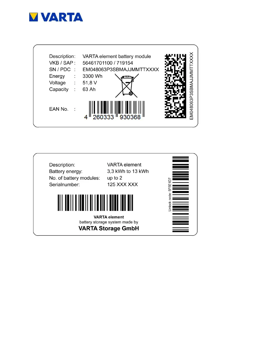 Varta element Series - Figure 9: ID Label of the Battery Module (Example); Figure 10: Activation Code Label (Example)