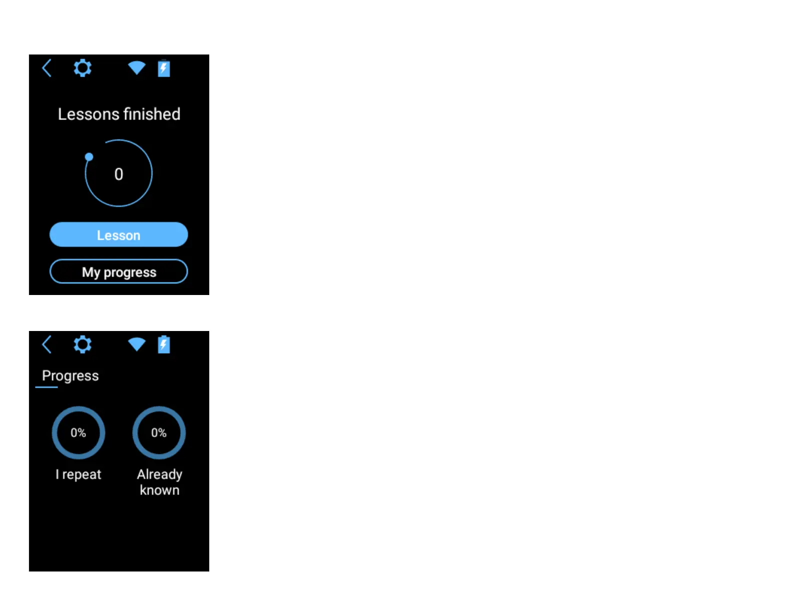 Tap My progress to display pie charts showing your progress and a list of already known words.