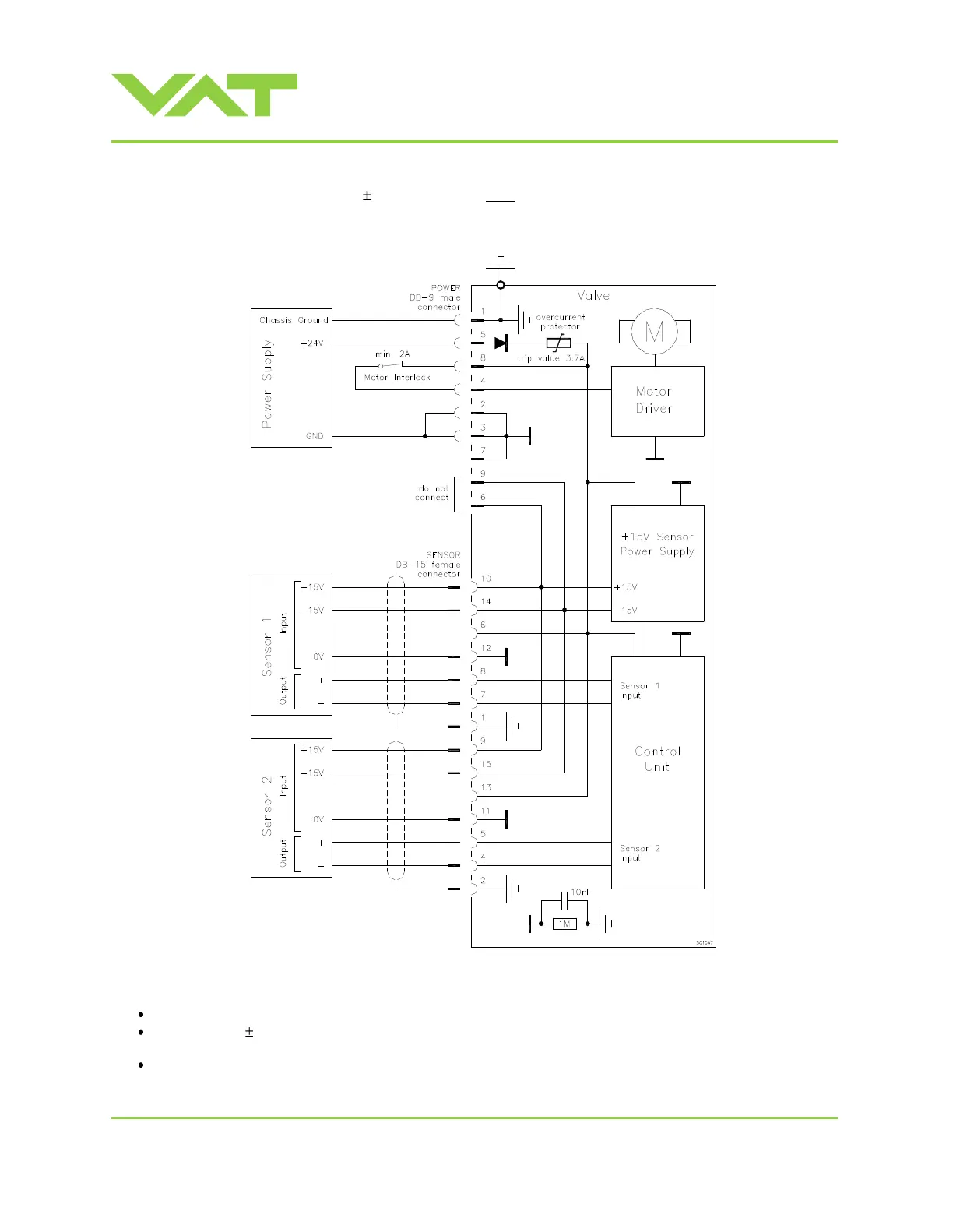 Connect the 15 VDC sensors at DB–15 female sensor connector exactly as shown in the drawing above. Do not