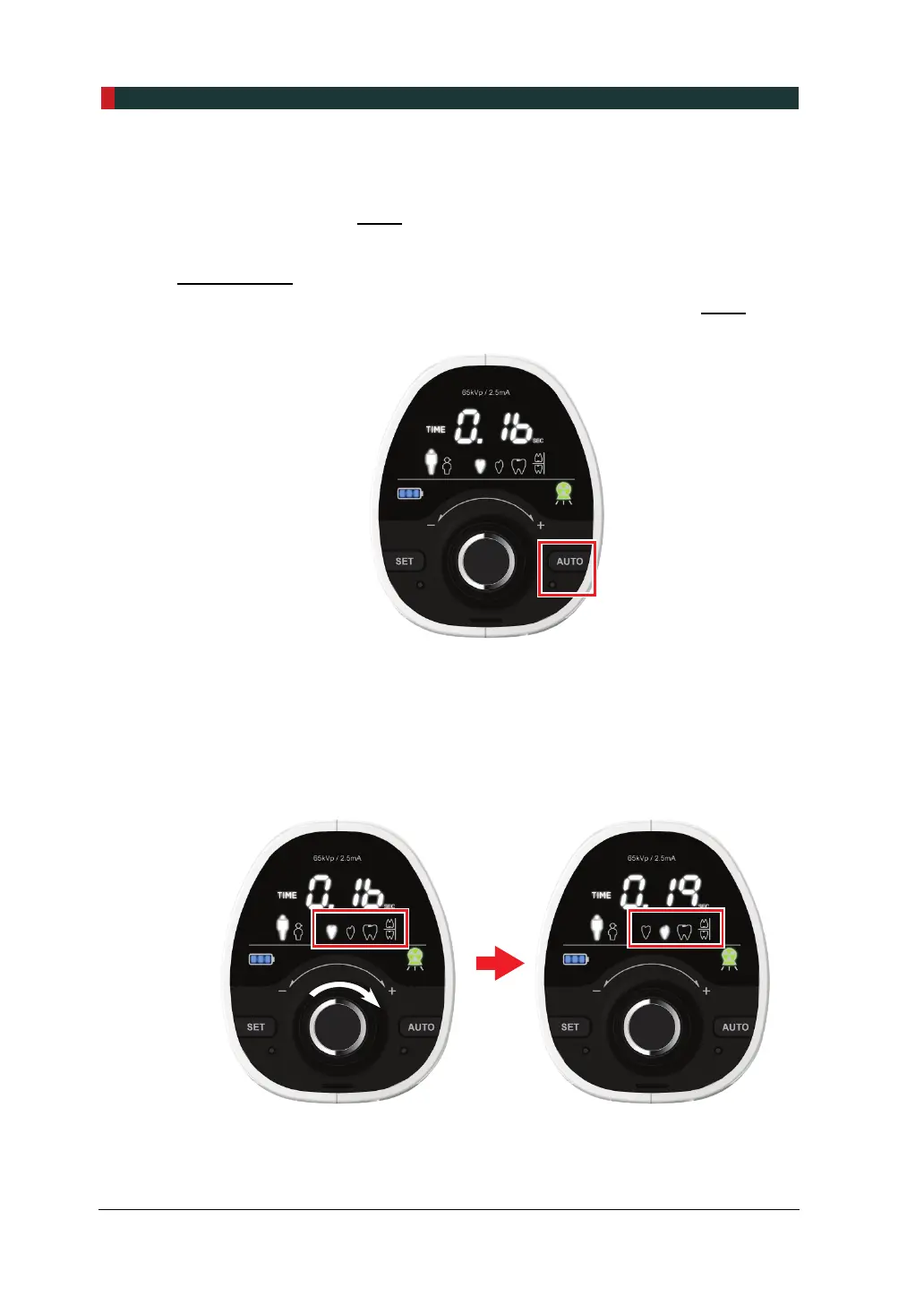 2. Cuando el área de selección del tipo de pieza dental parpadee, gire el dial para