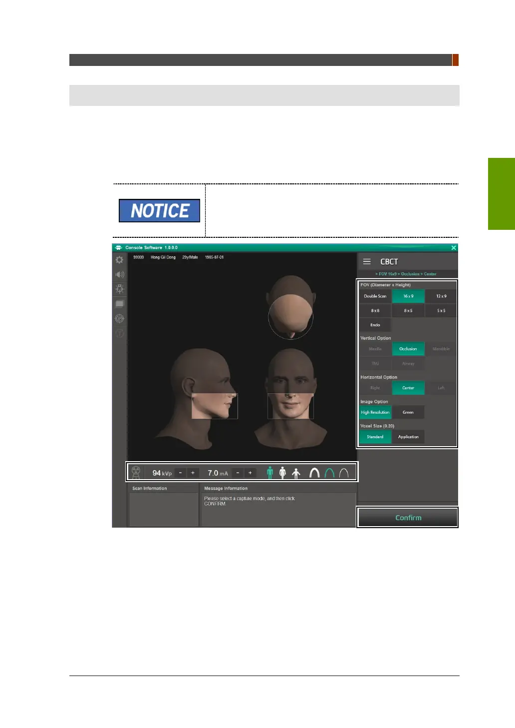 Pour l’acquisition d’images CBCT, il faut d’abord avoir suivi la procédure décrite dans 2.