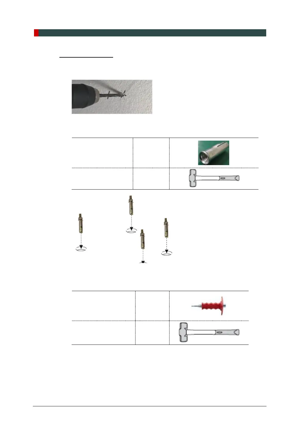 1. Drill the wall holes of size 10.5 mm x 30 mm (depth) using the concrete hammer