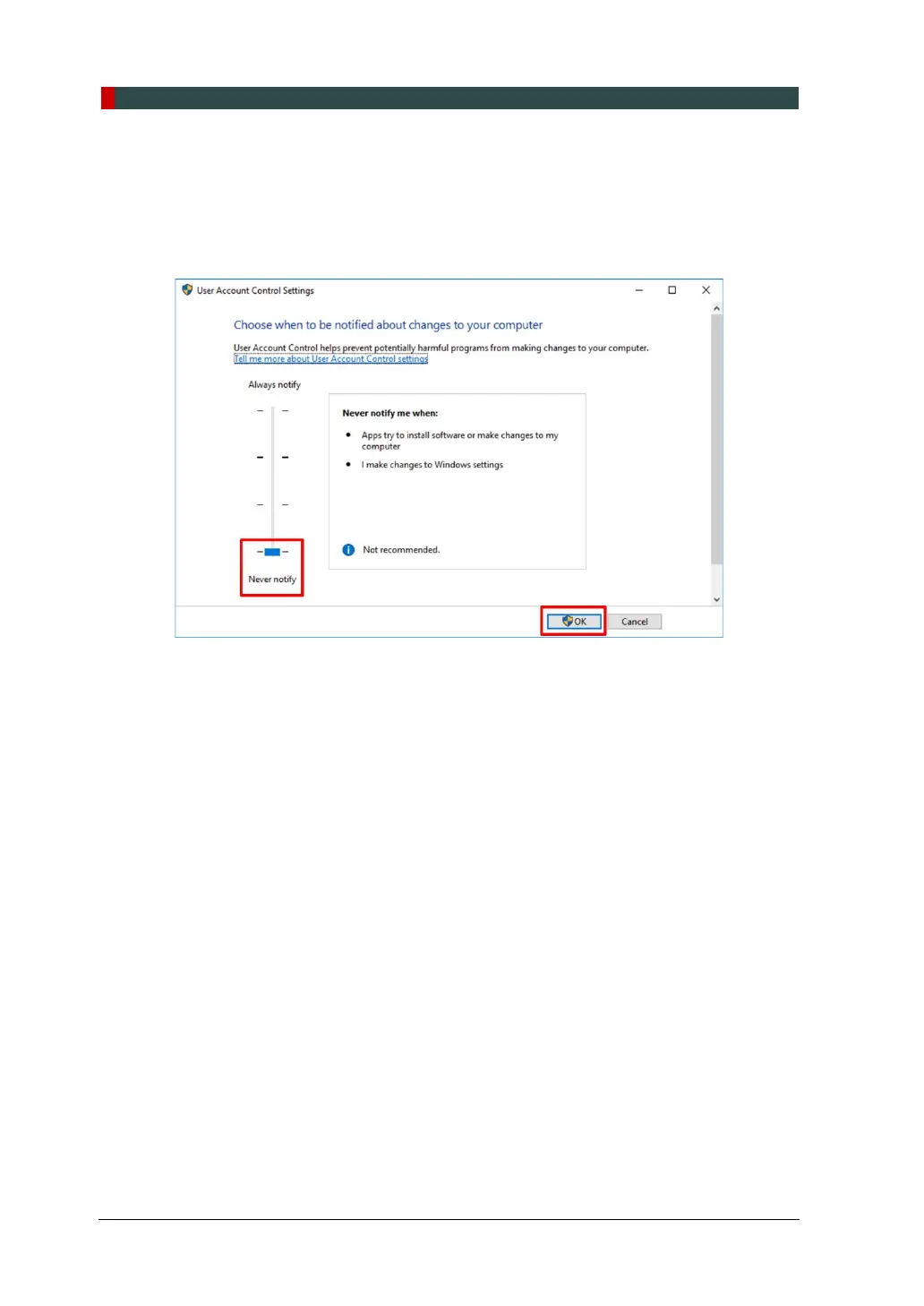 2. Disable the UAC by moving the slider bar down to the bottom, Never notify. Then,
