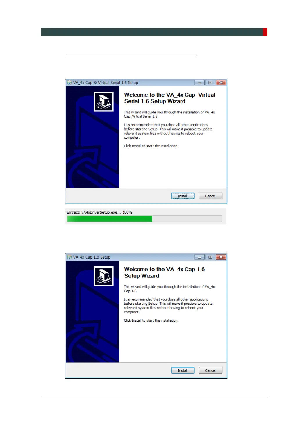 2. During installation, VA_4x Cap 1.x installation wizard will appear. Click Install to start
