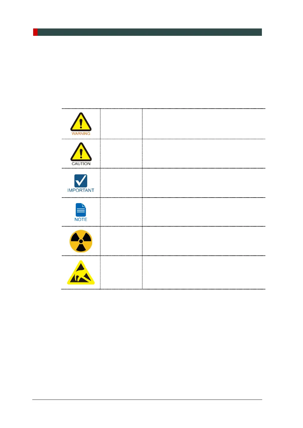 The following symbols are used throughout this manual to emphasize information or
