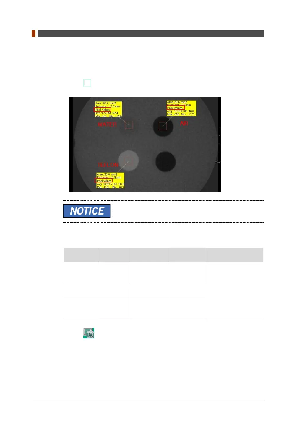5. Compare the CT NUMBER average values from the WATER, TEFLON, AIR areas