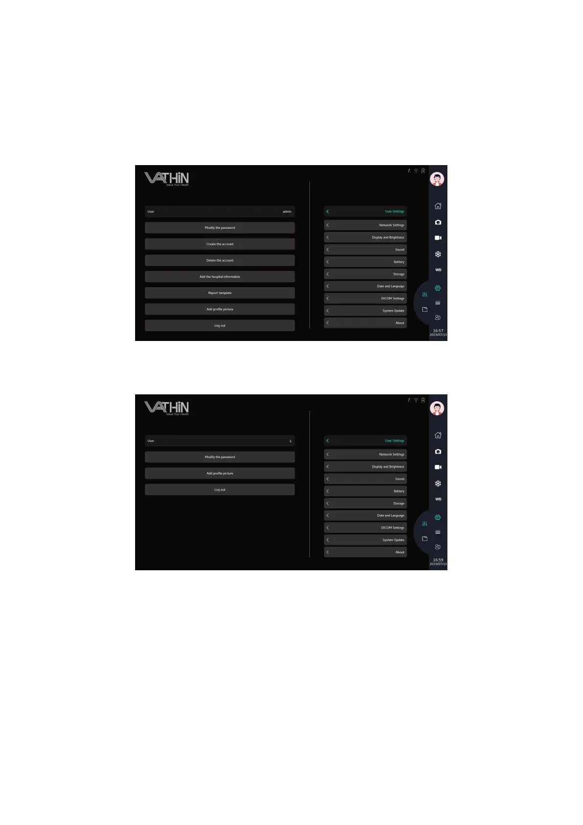users, delete users, add hospital information, modify report templates, add avatars, and log out.