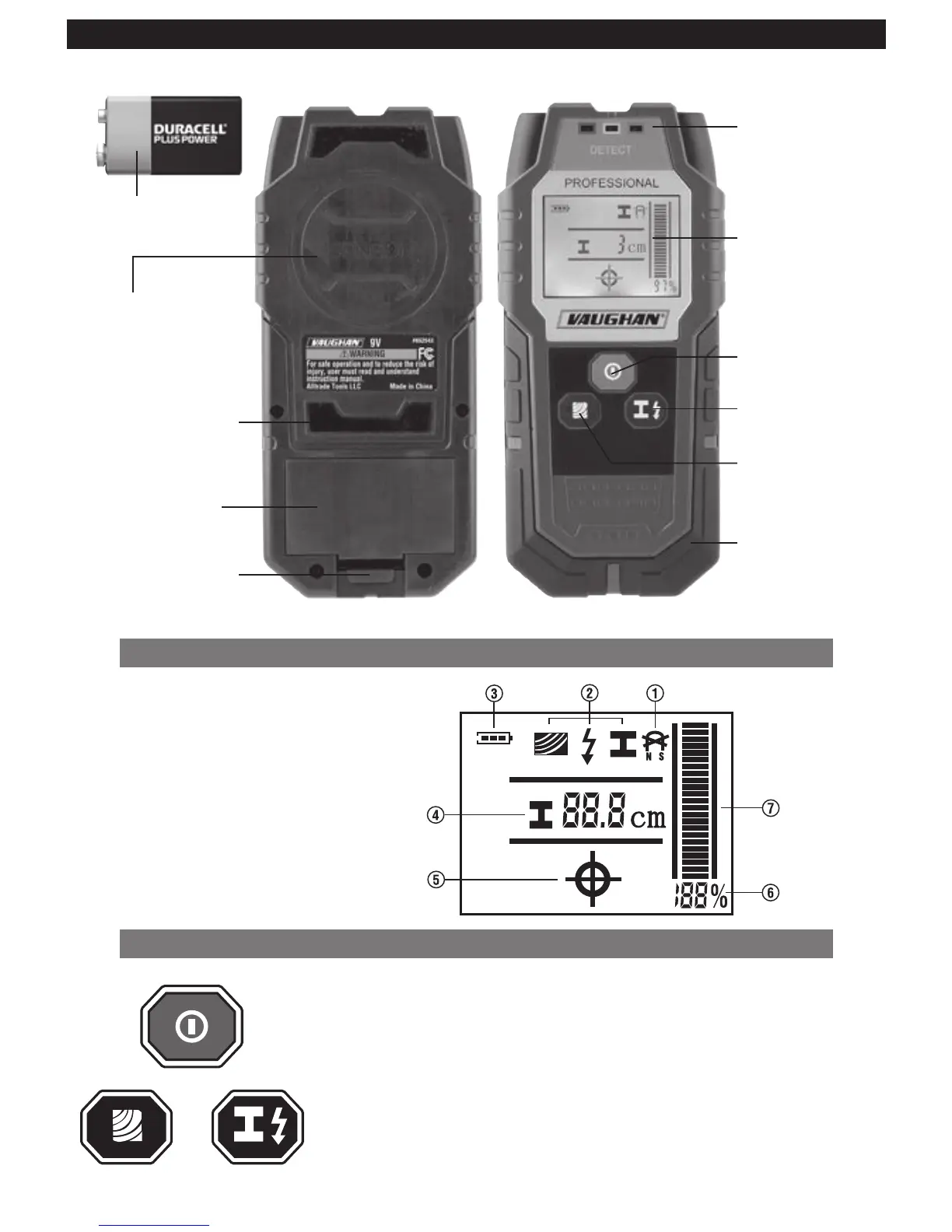 Black Button (Left): Press to set sensor for “Wood”(stud/joist) detection mode.