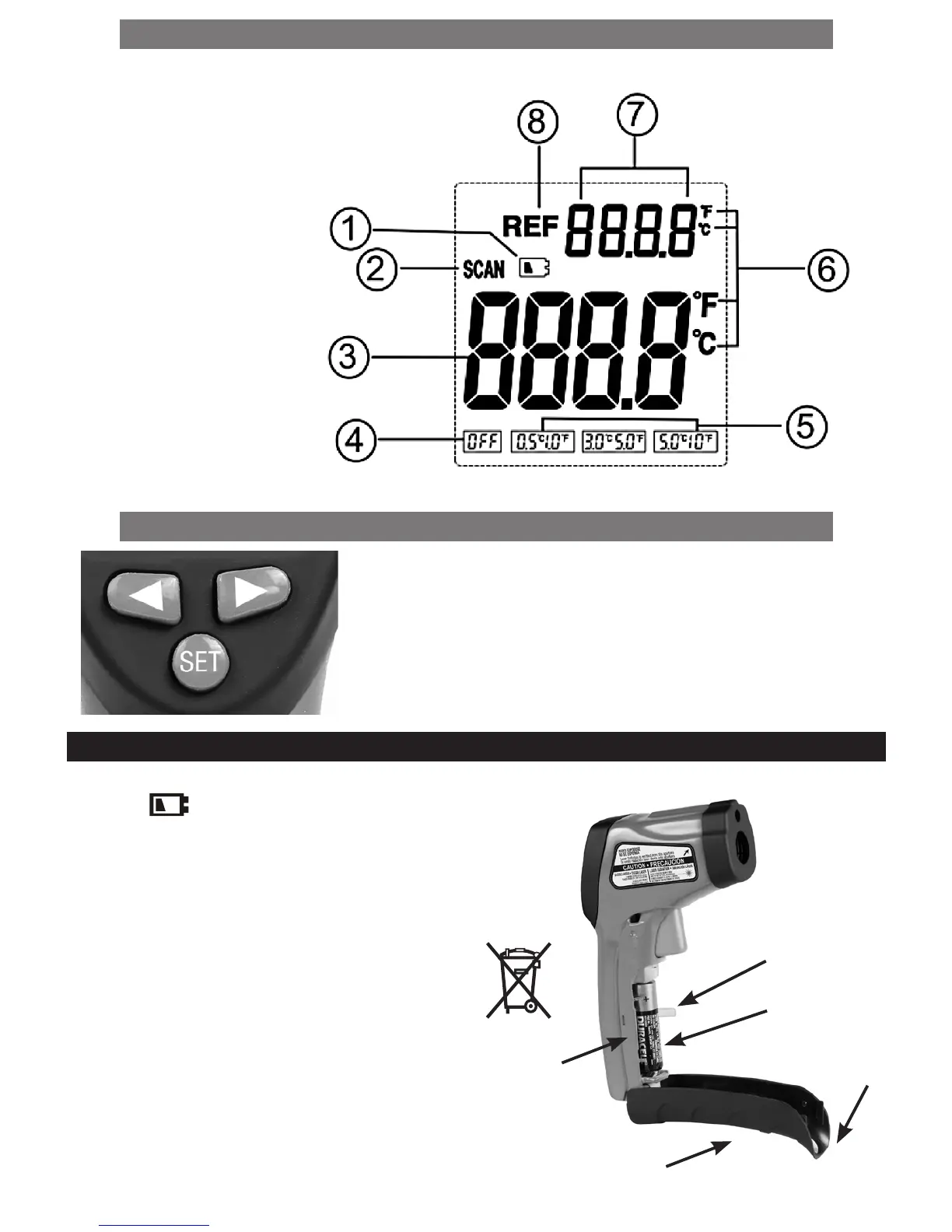 • SET button: Sets Reference Temperature, °C or °F unit and Emissivity