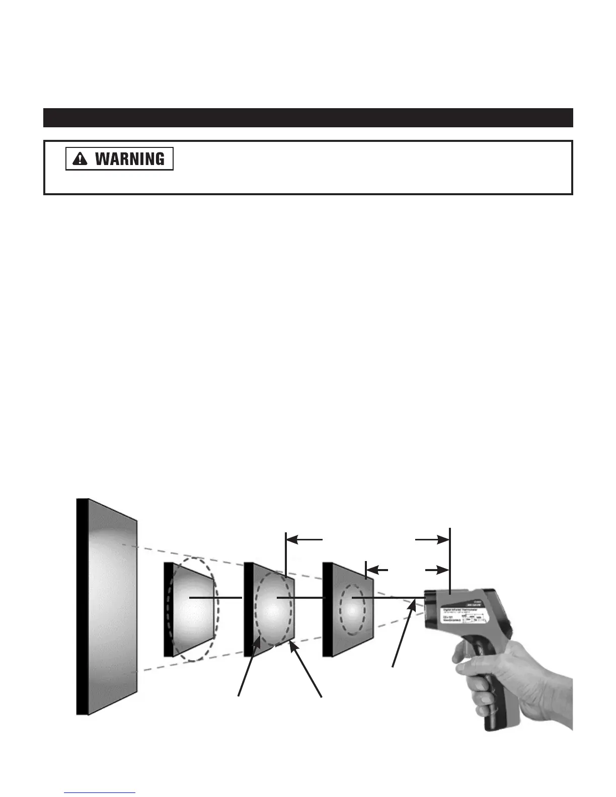 of the surface (S) is 1 ft., the distance (D) between the IR thermometer and surface should be LESS than 11 ft.