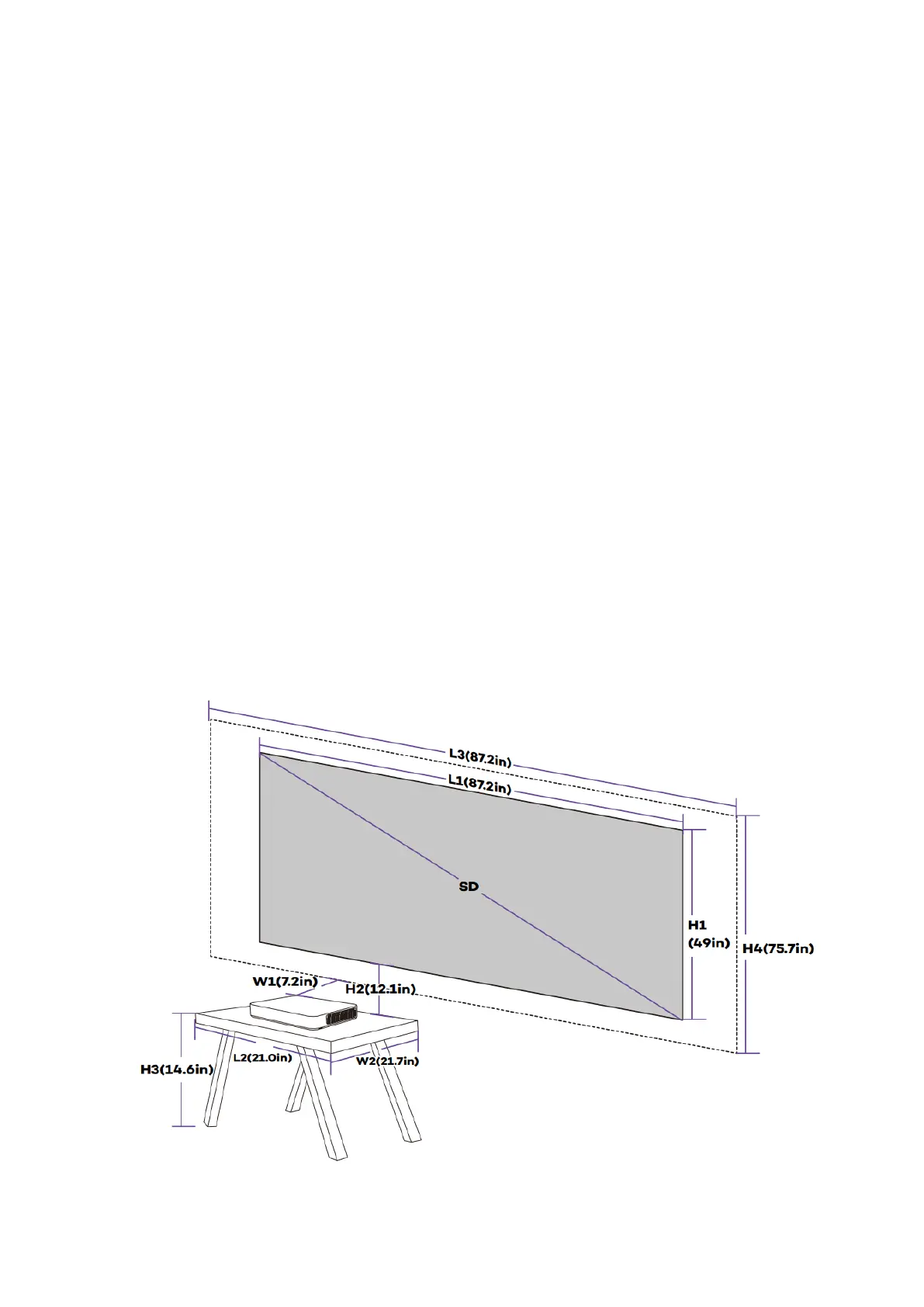 gewünschten Bildgröße. Wandfläche: Länge (L3, ≥L1) x Breite (H4, ≥H1 + H2 + H3) im