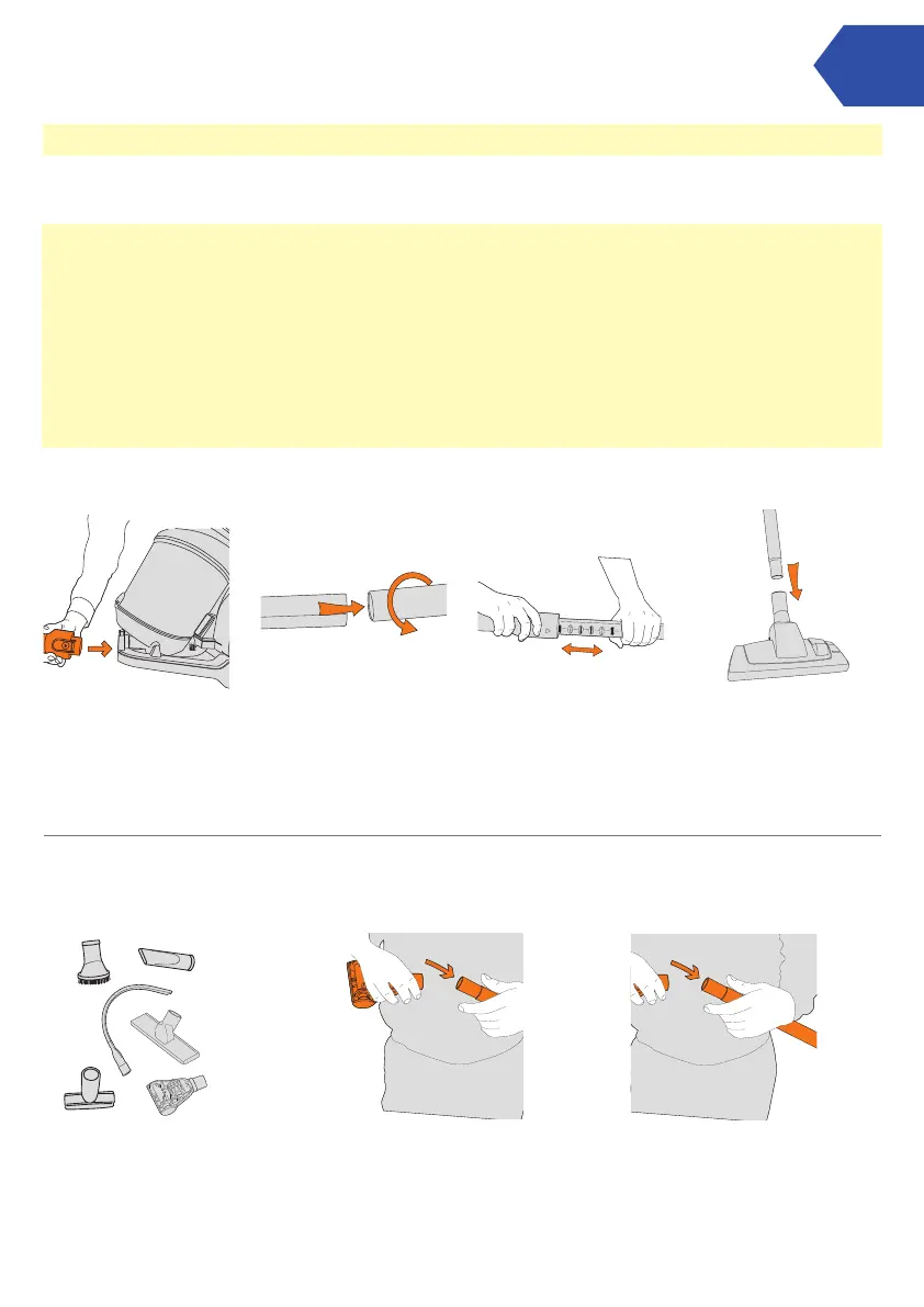 CAUTION: Always switch o the vacuum cleaner before connecting or disconnecting the hose/attachments, or