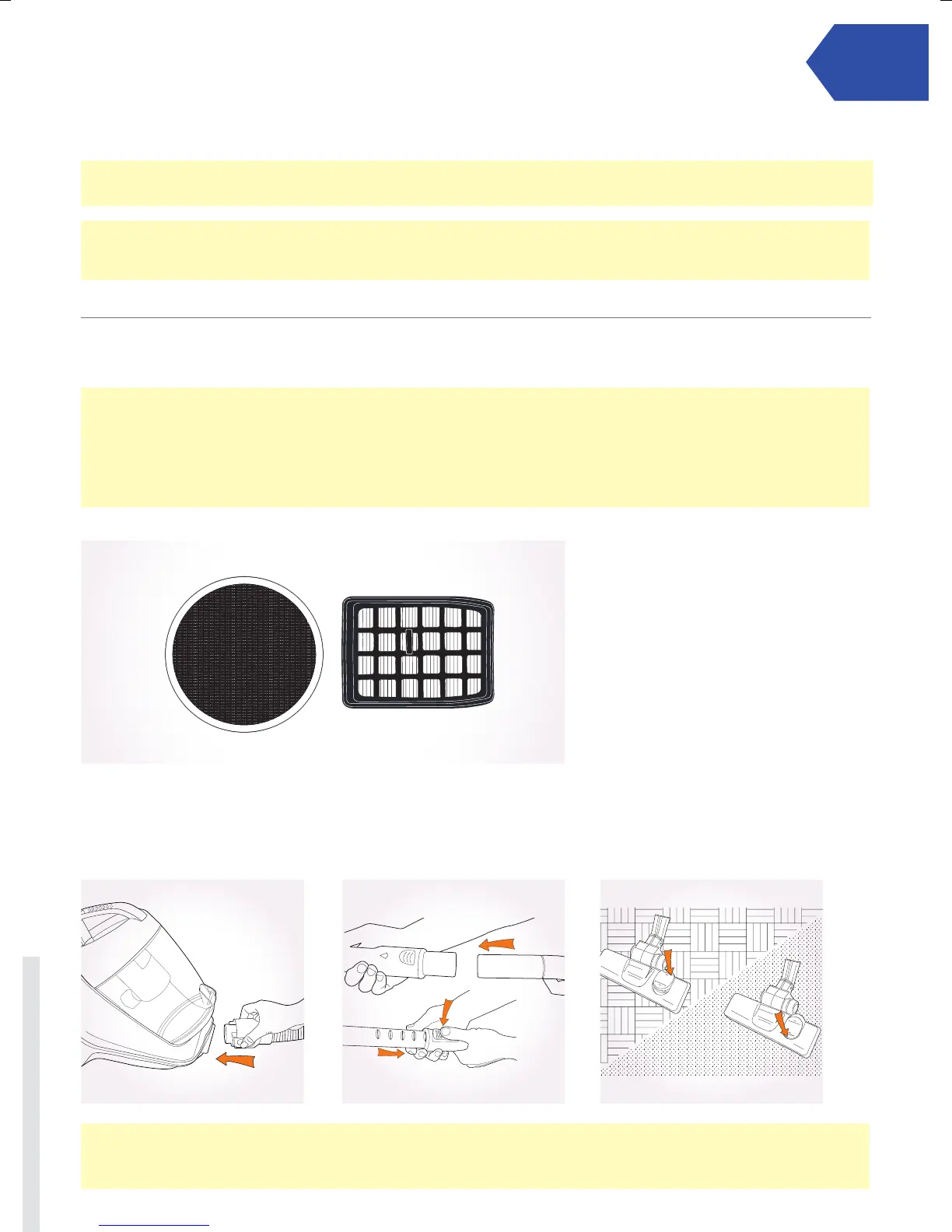 IMPORTANT: Do not use the vacuum cleaner with blocked lters and without all of the lters in place.