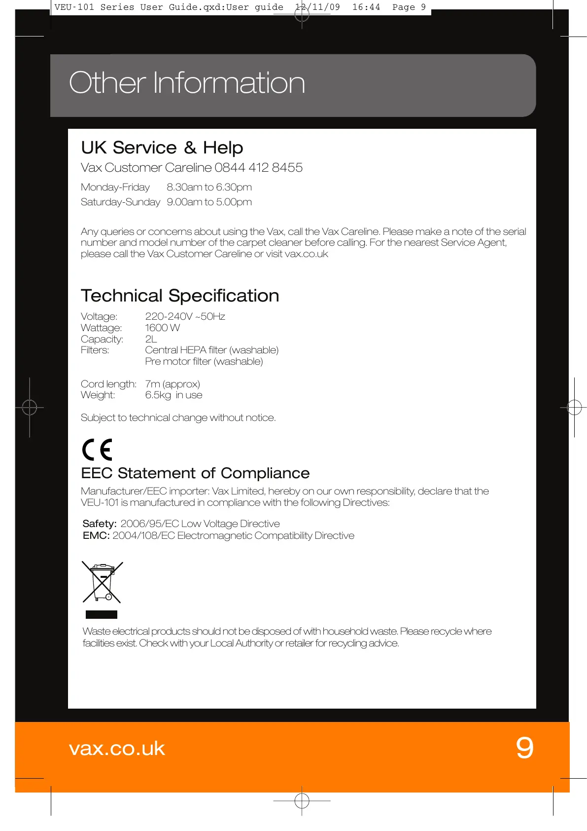 Manufacturer/EEC importer: Vax Limited, hereby on our own responsibility, declare that the