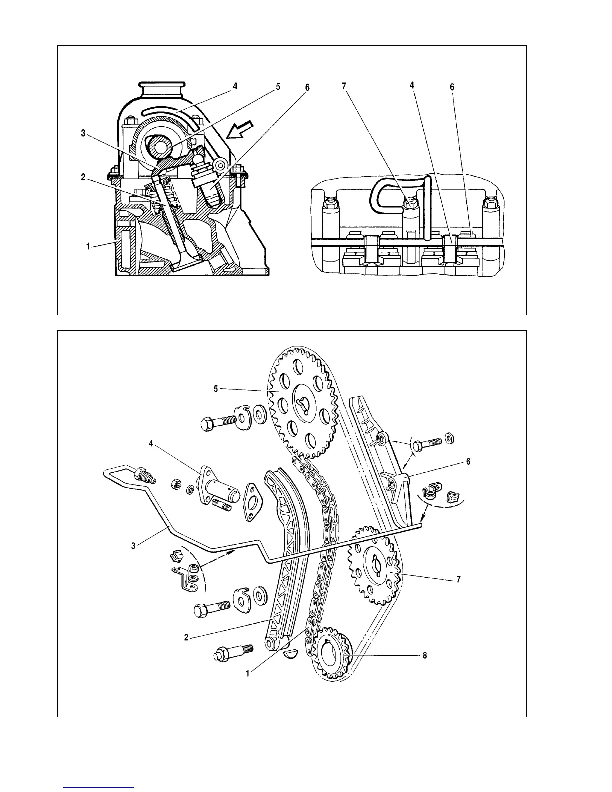 1 - chain; 2 - tensioner shoe; 3 - oil delivery pipe to tensioner; 4 - chain tensioner; 5 - camshaft sprocket; 6 - chain damper; 7 - oil pump shaft sprocket; 8 - crankshaft