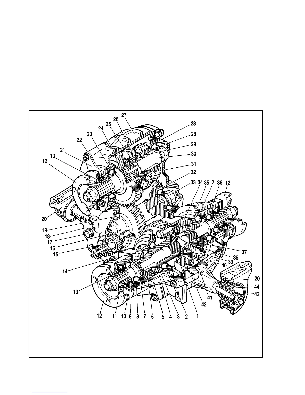 drive shaft bearing; 37 - rear axle differential gear; 38 - pinion; 39 - pinion shaft; 40 - pinion shaft circlip; 41 - spring washer; 42 - front axle differential gear; 43 - transfer