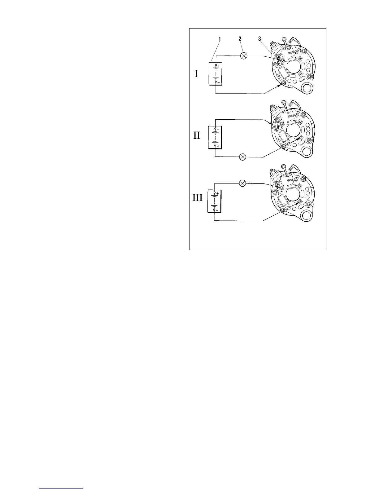 1 - battery; 2 - warning light; 3 - alternator; I - concurrent check of positive and