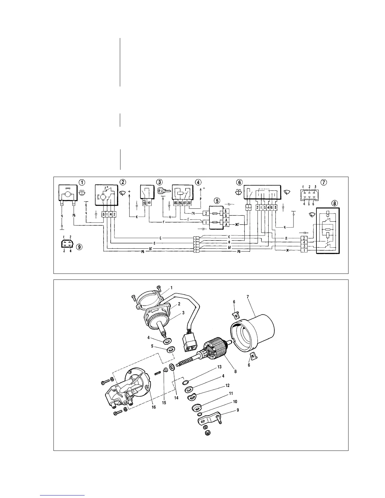 connector; 8 - windscreen wiper relay; 9 - pin assignment of wiper relay and motor connectors